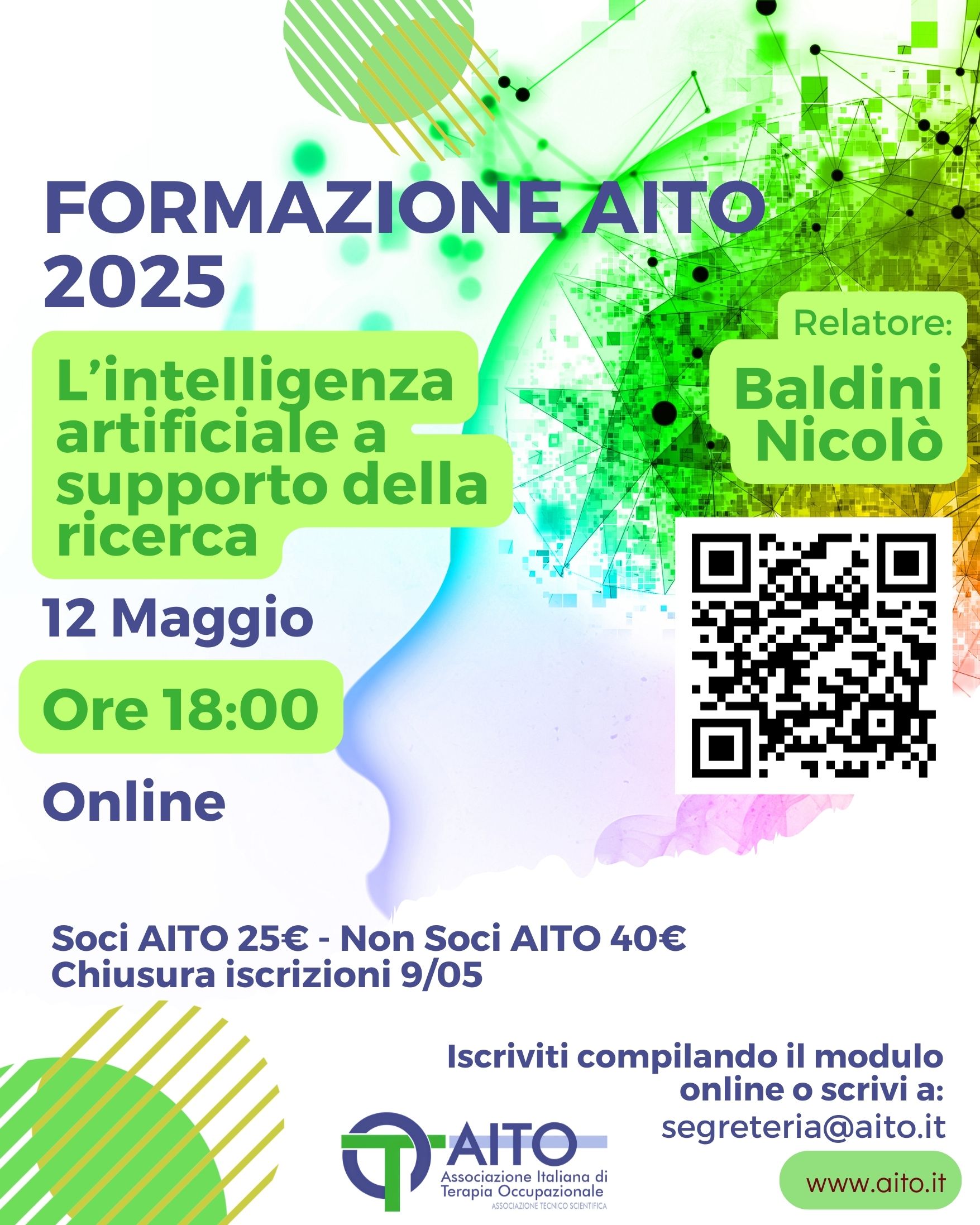 Organizzato da AITO – Associazione Italiana di Terapia Occupazionale, questo evento formativo intende fornire ai partecipanti una panoramica aggiornata e concreta sulle potenzialità dell’IA, stimolando riflessioni critiche e favorendo l’integrazione di nuove competenze tecnologiche nella pratica professionale quotidiana.