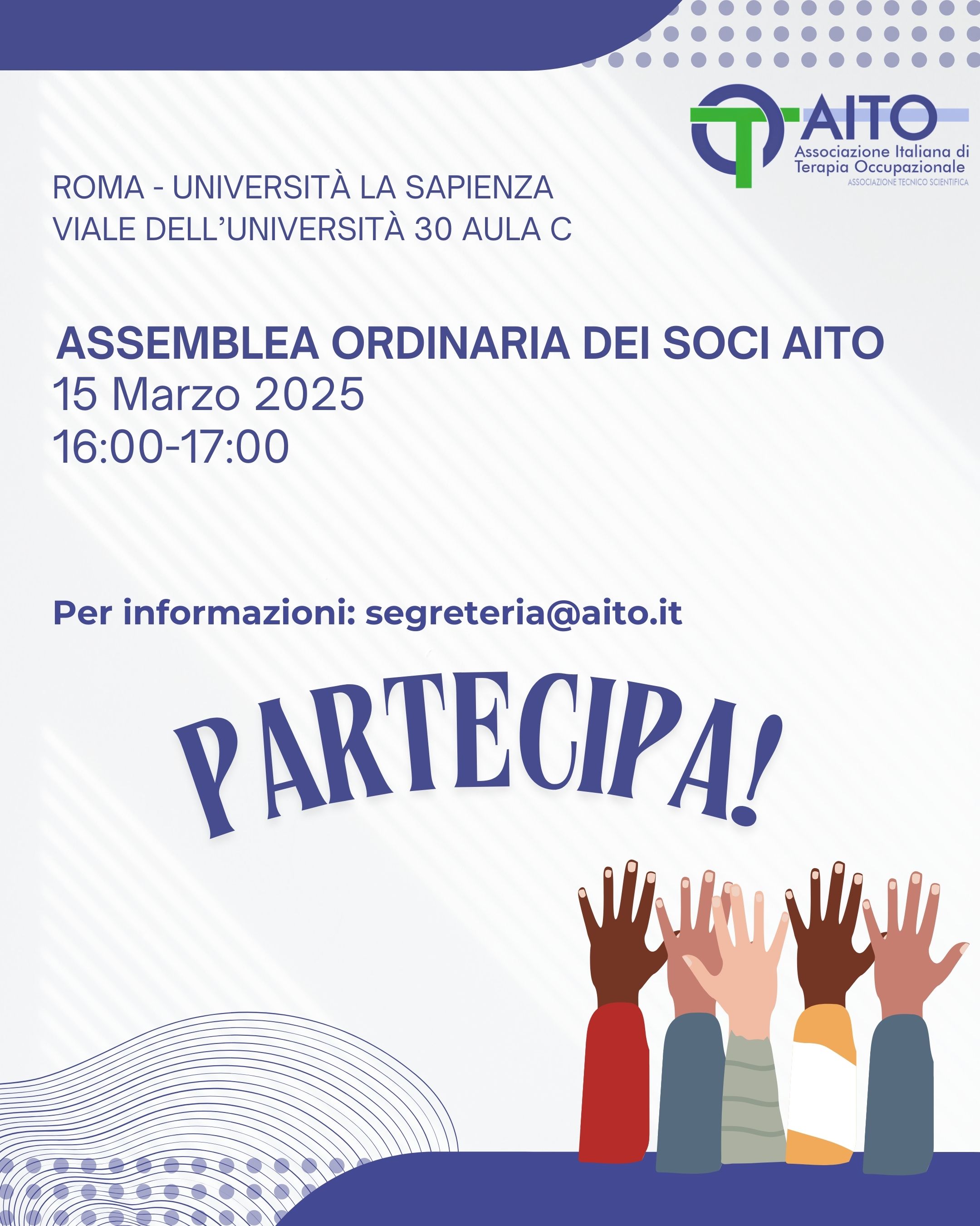 In allegato la Convocazione per la riunione 2025, che si terrà a Roma il 15 marzo alle 16.00, come anticipato nella NL di fine anno, subito dopo il Corso "Terapia occupazionale basata sulle evidenze: Rehabilitation 2030 e pacchetti di intervento dell'OMS"