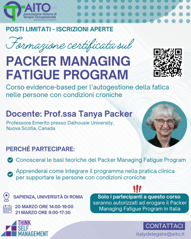 Perché partecipare: Apprenderai come integrare il programma nella pratica clinica per supportare le persone con condizioni croniche; solo i partecipanti a questo corso saranno autorizzati ad erogare il Packer Managing Fatigue Program in Italia