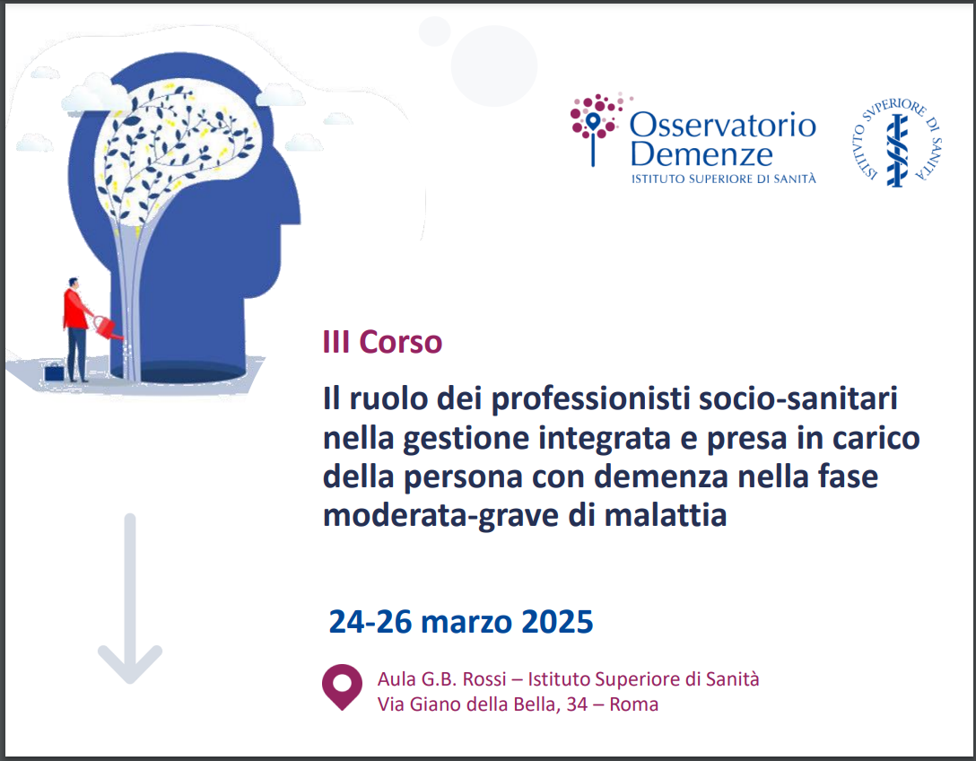 Il corso si inscrive nell’attività del Fondo per l’Alzheimer e le Demenze (Decreto del Ministero della Salute del 23 dicembre 2021, GU. N.75 del 30 marzo 2022) volta alla definizione ed attuazione di iniziative di formazione che rafforzino, con modalità integrate, conoscenze e competenze specifiche di tutte le figure professionali socio-sanitarie coinvolte nella presa in carico della persona affetta da demenza.