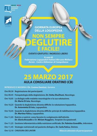 Per quanto detto, in occasione della Giornata Europea della Logopedia, la federazione logopedisti italiani Abruzzo-Molise, in associazione con il Centro Alzheimer di Campobasso e con il patrocinio dell’Associazione Italiana Terapisti Occupazionali (A.I.T.O.) propone l’evento : Non sempre deglutire è facile!