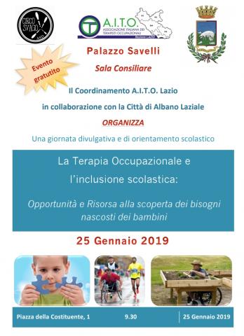 Albano Laziale - Palazzo Savelli 25 gennaio 2019 La Terapia Occupazionale e l’inclusione scolastica: Opportunità e Risorsa alla scoperta dei bisogni nascosti dei bambini L'incontro, aperto a tutti, sarà diviso in due sessioni (una mattutina, dalle 9.30 alle 13.00; una pomeridiana, dalle 15.00 alle 18.00) ed entrerà subito nel vivo grazie all'intervento del Dott. Michele Senatore, Presidente dell'A.I.T.O., e di altri terapisti occupazionali che svolgeranno dei laboratori pratici con bambini all'insegna del gioco e dello sviluppo delle loro abilità creative ed espressive. Lo scopo è quello di portare alla conoscenza di tutti la terapia occupazionale, vista come risorsa ed opportunità, ma anche di sensibilizzare le amministrazioni comunali sul problema dell'inclusione dei bambini con difficoltà. Insieme ai terapisti dell'A.I.T.O. , nel pomeriggio, interverranno i dirigenti scolastici del territorio. La giornata si animerà secondo il programma che segue:: "Terapia occupazionale ed inclusione scolastica - opportunità e risorsa" (a cura del Presidente Michele Senatore) è il tema introduttivo, al quale seguiranno un laboratorio pratico (ore 10.30) e una discussione moderata dal Dott. Litterio Runza (referente dell'A.I.T.O. Lazio); anche il pubblico intervenuto e i genitori presenti all'incontro potranno porre delle domande agli esperti, fino al termine della sessione, alle 13.00. Nel pomeriggio, dopo i saluti dell'amministrazione comunale e dei dirigenti scolastici, l'Assessore della Pubblica Istruzione e delle Poliche Educative, Alessandra Zeppieri, affronterà Il tema dal titolo: "la Pubblica Istruzione: Servizi e Risorse" (Ore 15.00). Alle16.00, prenderà la parola la Dott.ssa Patrizia Garzia, neuropsichiatra infantile e dirigente medico dell'unità ospedaliera TSRMEE di Ariccia parlando dello "sviluppo del bambino normale e patologico"; alle 16.30 il Dott. Litterio Runza affronterà il tema dei bisogni, cosiddetti "incontrollati", dei bambini per poi lasciare spazio al laboratorio pratico curato da Jacopo Beretta, dell'ASD "Circo Svago" (dall17.00 alle 18.00).