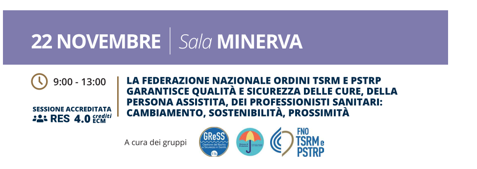 "LA FEDERAZIONE NAZIONALE ORDINI TSRM E PSTRP GARANTISCE QUALITÀ E SICUREZZA DELLE CURE, DELLA PERSONA ASSISTITA, DEI PROFESSIONISTI SANITARI:CAMBIAMENTO, SOSTENIBILITÀ, PROSSIMITÀ" organizzata dai gruppi GReSS e SPePA DELLA FNO TSRM e PSTRP in occasione del prossimo Forum Risk Management 2023 di Arezzo, in data 22 novembre dalle ore 09:00 (Sala Minerva), che prevede l'accreditamento di 4 crediti formativi Ecm.