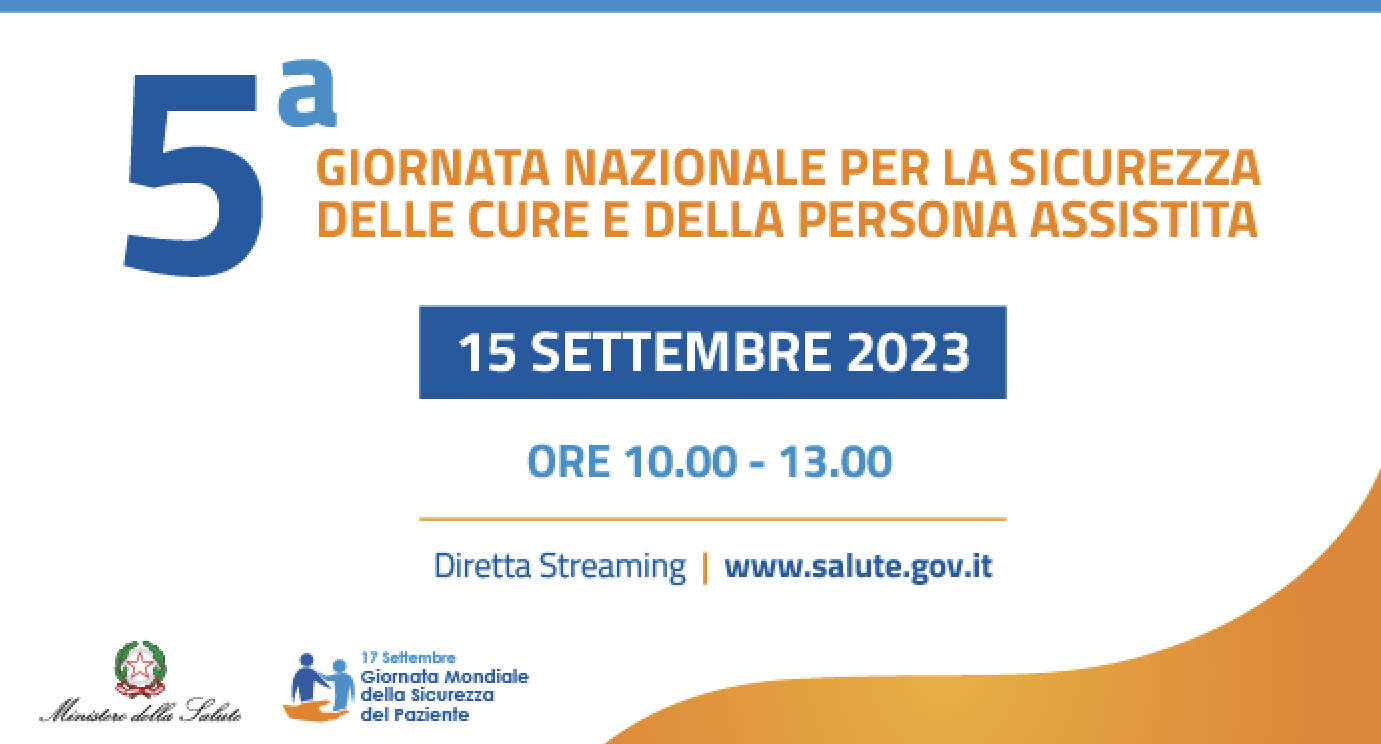Il prossimo 15 settembre alle ore 10,00, presso l'Auditorium "Cosimo Piccinno" del Ministero della salute, Lungotevere Ripa, 1, Roma, si terrà la 5ª Giornata Nazionale per la Sicurezza delle Cure e della Persona Assistita.