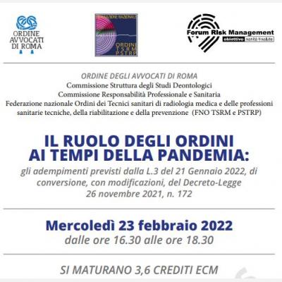 23 febbraio, online - IL RUOLO DEGLI ORDINI AI TEMPI DELLA PANDEMIA: GLI ADEMPIMENTI PREVISTI DALLA L.3 DEL 21 GENNAIO 2022, DI CONVERSIONE, CON MODIFICAZIONI, DEL DECRETO-LEGGE 26 NOVEMBRE 2021, N. 172